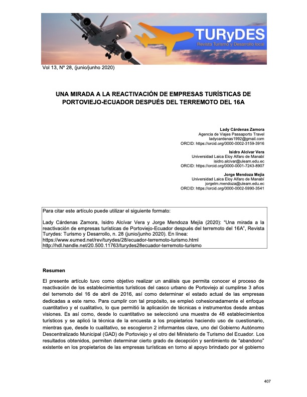 UNA MIRADA A LA REACTIVACIÓN DE EMPRESAS TURÍSTICAS DE PORTOVIEJO-ECUADOR DESPUÉS DEL TERREMOTO DEL 16A